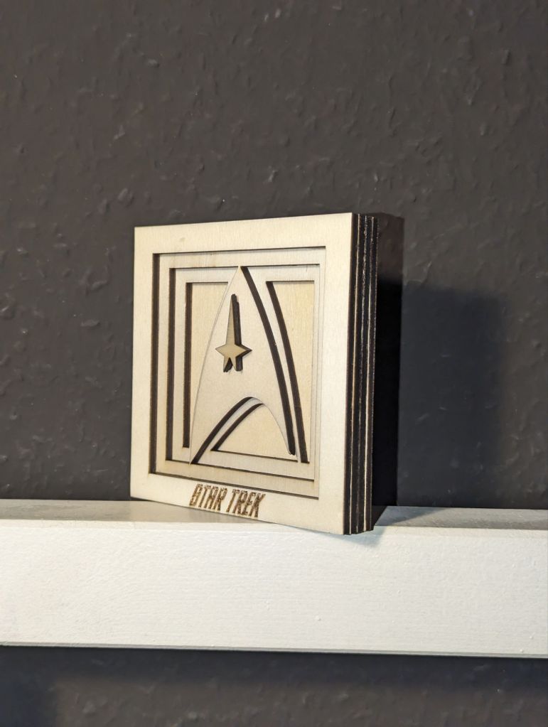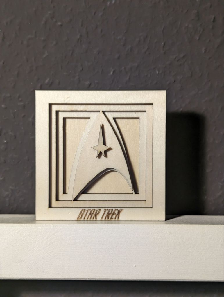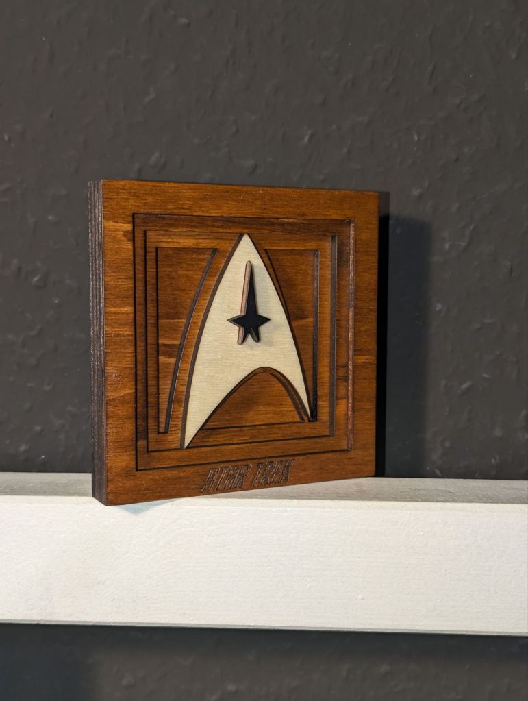 Was auch neu ist, ist das Star Trek Logo in gebeizter Form. Mittels teakfarbender und schwarzer Beize wird dem Pappelholz eine edle Holzoptik verliehen.