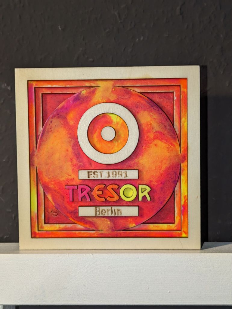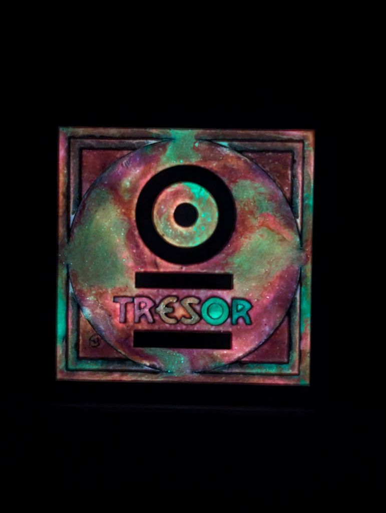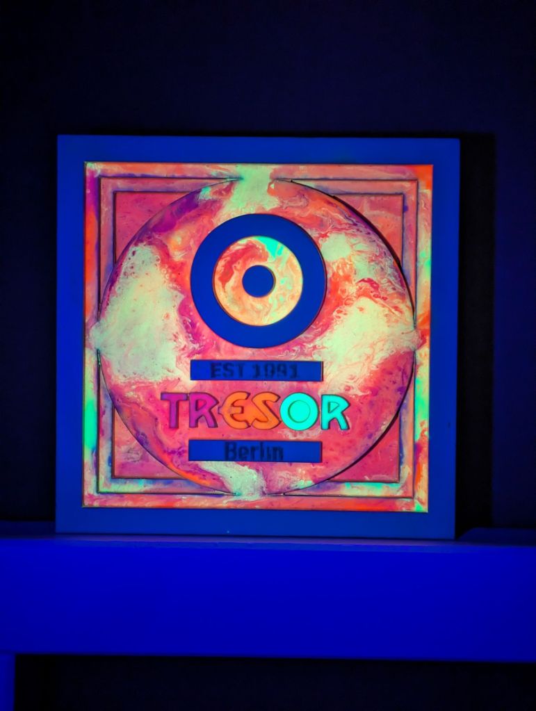 Die „bunten“ Logos wurden mit fluoreszierender Farbe und nachtleuchtpigmenten veredelt. Mittels Pouring werden sie zu absoluten Unikaten!